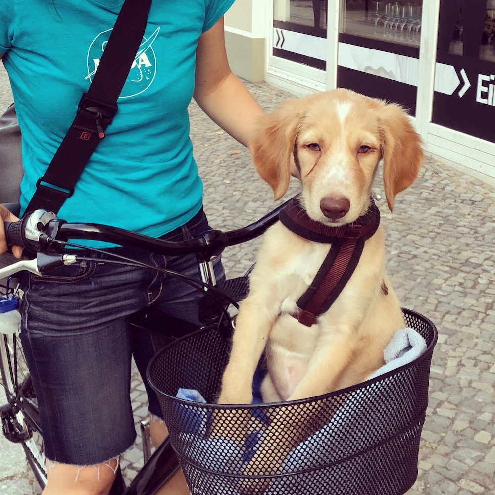 So sind die ersten Monate, in denen er so rasant wuchs und sich entwickelte, wahnsinnig schnell an uns vorbei gegangen. Aus dem Fahrradkorb, den wir für unseren kleinen Welpen vorbereiteten, damit wir weitere Strecken zurücklegen konnten, wuchs er so schnell heraus, sodass wir diesen nie nutzen konnten.