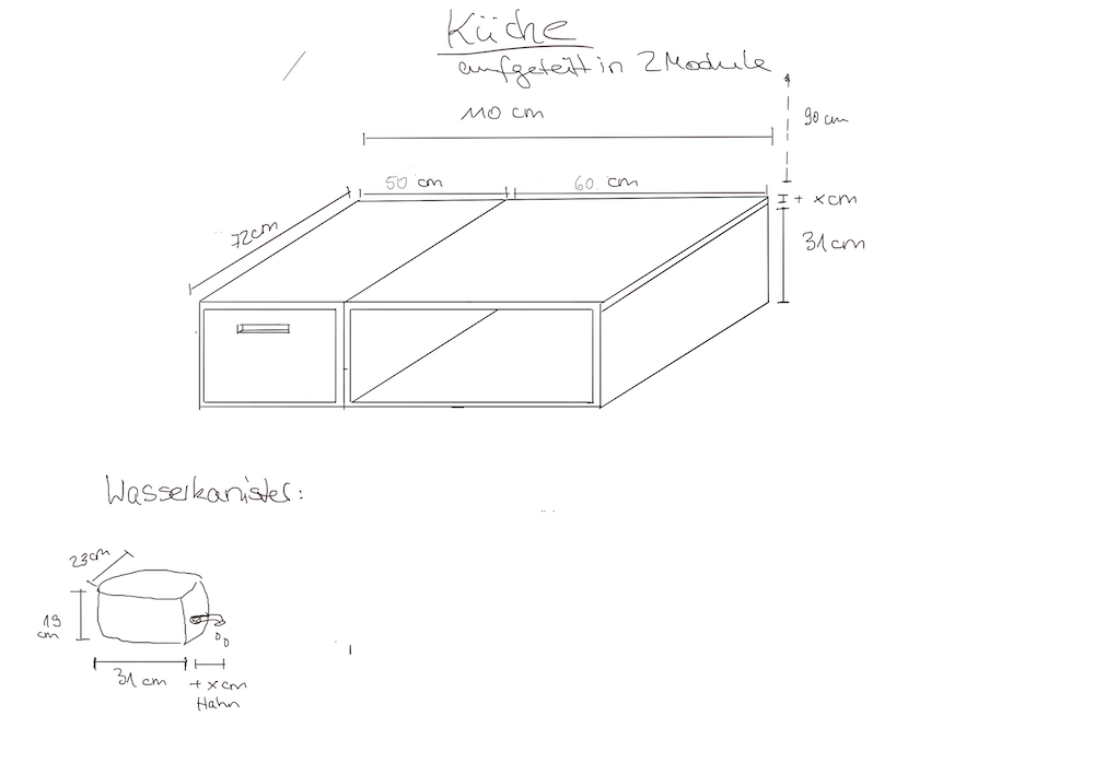 Durch den Wunsch, das Auto auch im Alltag nutzen zu können, ergab sich, dass wir nicht nur eine, sondern zwei Kisten bauten, damit wir diese einfacher aus dem Kofferraum entfernen und tragen konnten – alles andere wäre zu sperrig geworden. Auch ein Steck-Konstrukt aus Balken war für unsere Vorstellungen nicht zu gebrauchen (obwohl dies auch seinen Charme hat, da es an Leichtigkeit nicht zu übertreffen ist), da ich vor hatte, in einer der Kisten ein Schubladenelement als Küchenzeile einzubauen. Es stand also fest, es sollten zwei Kisten entstehen.