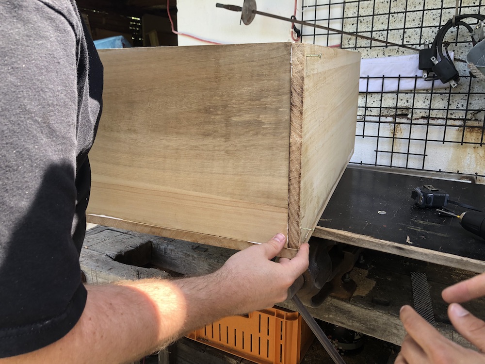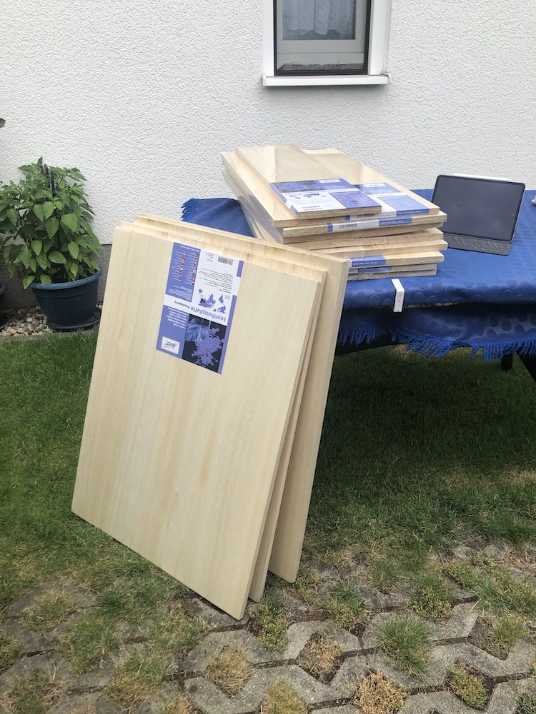 Eine Info vorneweg: beim Zusammenbau unserer Kisten stellten wir fest, dass die oberen Platten, auf denen wir liegen, nicht aus Paulowniaholz sein sollten, da sich diese zu sehr verbogen – das war uns zu heikel. Nachdem wir also die obersten Platten wieder demontierten (versucht mal Holzleim wieder auseinander zu bekommen… 😩), entschieden wir uns für eine 1,2cm dicke Mulitplexplatte, die bis heute beste Dienste geleistet hat. Insgesamt bin ich aber froh, größtenteils Paulownia verarbeitet zu haben, das macht die Kisten wirklich angenehm leicht zu tragen und zur Saisoneinweihung 2020 stellte ich mit Freude fest, dass sich dieses Holz in der Tat nicht verzogen hat und immer noch so passt, wie am Anfang konstruiert.