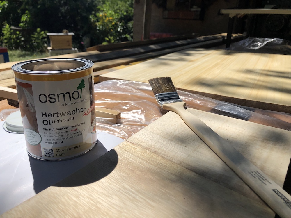Nachdem das Holz dann zugeschnitten war, brauchte es natürlich eine Schutzschicht vor Feuchtigkeit, Abrieb und Dellen. Hier verwendete ich das breit empfohlene Hartwachs-Öl von Osmo. Was für Holzfußböden gut ist, ist für unsere Kisten umso besser!