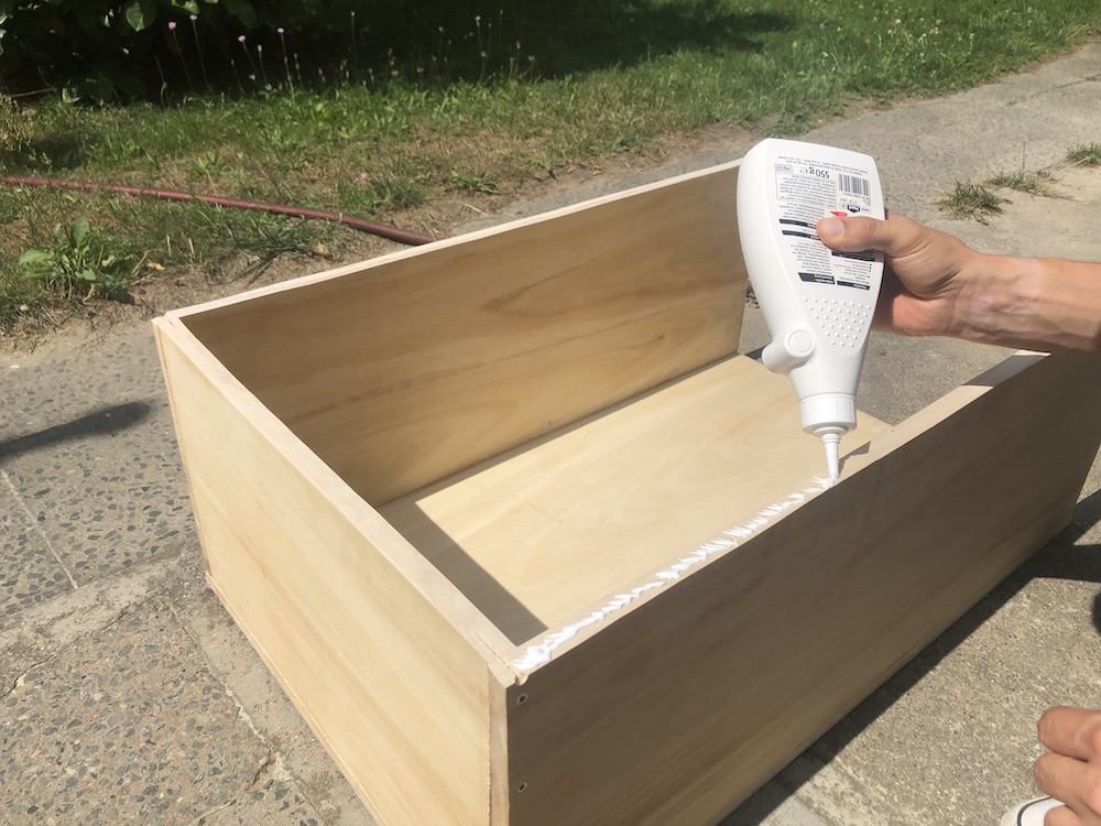 Nachdem das Holz schön getrocknet war, konnte es endlich zusammen gebaut werden. Hierfür verwendeten wir einfache Holzschrauben, Holzleim sowie einen Akkuschrauber. Damit die Schrauben beim Verleimen direkt an der richtigen Stelle landen, bohrten wir die Löcher etwas vor/an und fügten dann den Holzleim auf den Rand. Anschließend zogen wir alles mit dem Akkuschrauber fest.