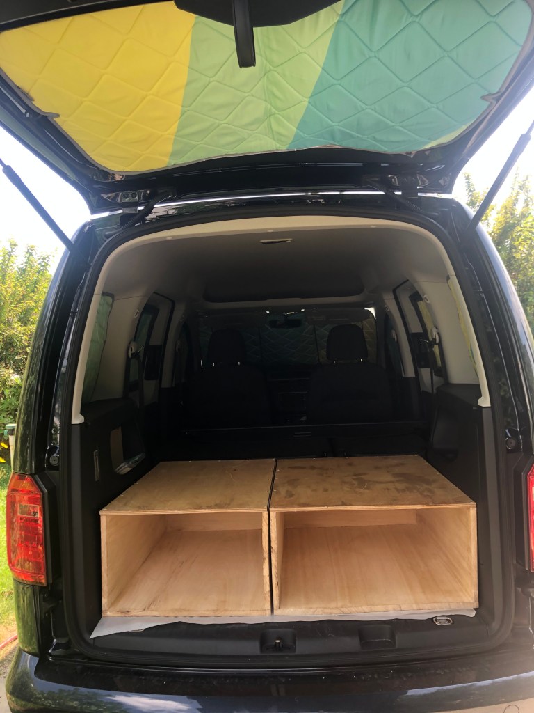 Da wir die Rücksitzbank im Fahrzeug lassen wollten, ergab sich für die Kisten, die im Bereich des Kofferraums die Liegefläche bilden, die erste Maßvorgabe: die Module durften maximal so hoch sein, wie die umgeklappten Rücksitze.