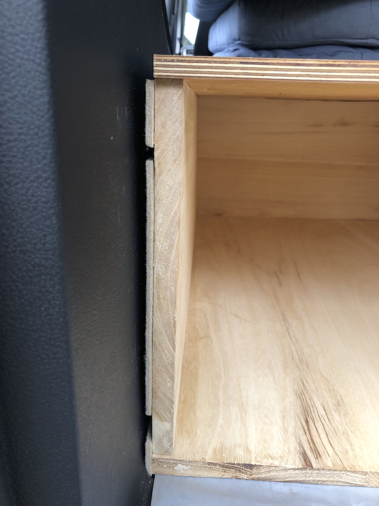 Am Rand der Kisten zur Fahrzeugwand haben wir noch Filzstoffleisten als Schutz ran geklebt. Dies sind gewöhnliche Rutschstopper, die man im Baumarkt für Stühle und Möbel erhält. Das macht dann auch richtig Spaß, wenn man die Kisten für eine neue Saison ins Autos stellt – durch den Filzstoff gleiten sie sehr schön an der Fahrzeugwand entlang.