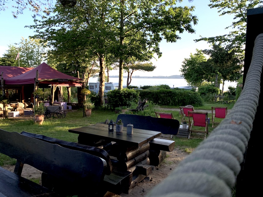 Da wir den Urlaub unserer Freunde nicht durch unseren spontanen Aufenthalt weiter beeinflussen wollten (und ich ein riesiges Problem mit stechenden Mücken hatte), sind wir am nächsten Tag wieder zur Insel Usedom. Dort besuchten wir den Naturcampingplatz Usedom. Wir wählten einen Platz direkt unten beim Achterwasser, wo nur kleinere Autos, Campers und Zelte hin konnten. Die Freude war extrem groß, da wir damit den Caravan-Wald hinter uns ließen. Der Stellplatz hatte eine fantastische Aussicht und schon bald gesellten sich Gleichgesinnte zu uns.
