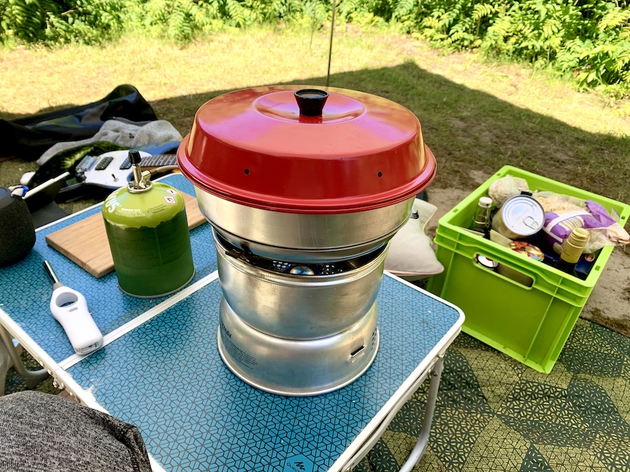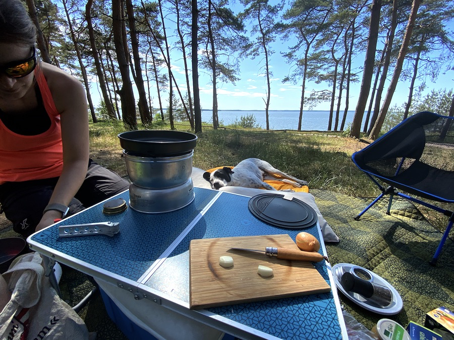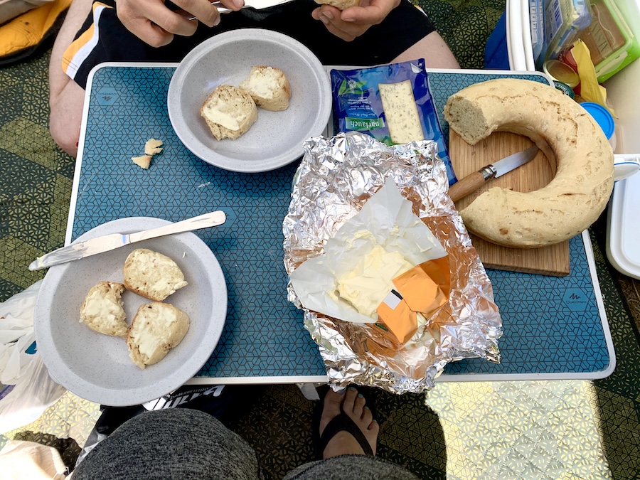 Auch Anton schien sich auf dem Campingplatz prächtig wohl zu fühlen und hatte durchweg einen total tiefen Schlaf. Am nächsten Morgen gab es leider keinen Brötchenservice, aber dafür konnte ich nun mein neustes Gadget ausprobieren: den Omnia Campingofen. Ich habe mir alle Backmischungen für Pizza, Kuchen und Brot zu Hause vorbereitet, sodass ich vor Ort die trockenen Zutaten nur mit Wasser und ggf. Alsan (Butter) mischen musste. Zum ersten Mal kam unserer Gaskocheraufsatz für den Trangia (Spirituskocher) zum Einsatz, da ich keine Lust auf Ruß auf unserem Essen hatte. An dem Morgen backte ich uns also ein Zwiebelbrot und es ist tatsächlich was geworden (ja ich bin immer noch überrascht und fasziniert zugleich)! Das Rezept habe ich für euch hier festgehalten: Zwiebelbrot.