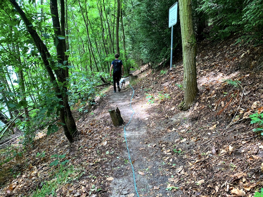 Auf der Wanderstrecke hinter der Brücke (ihr könnt es nicht verfehlen) gibt es eine sehr schöne Stelle, wo Hunde hinein laufen und anschließend auch schwimmen können. Nur auf die Kayakfahrenden solltet ihr etwas achten und natürlich grüßen. An dieser Stelle hat es bei Anton schließlich auch Klick gemacht – seit dem weiß er, wie er und dass er schwimmen kann!